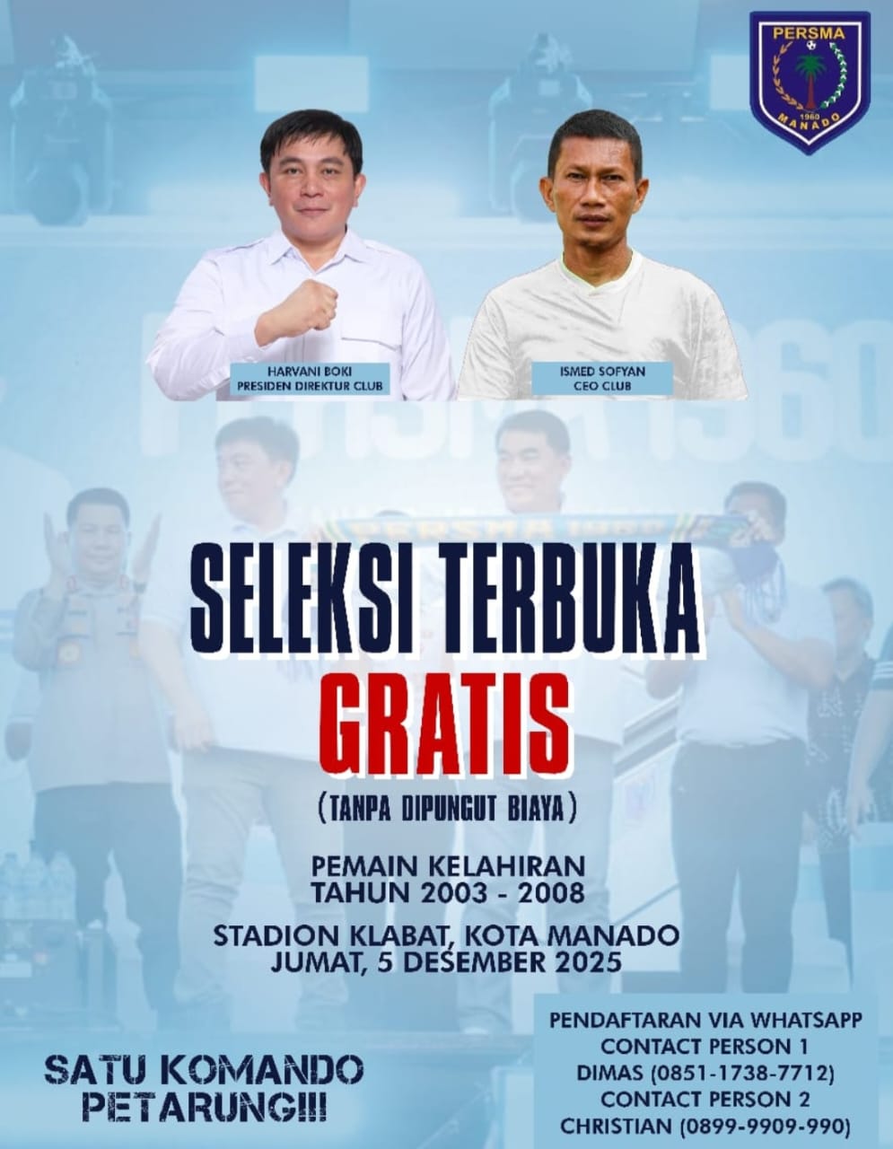Kali ini, upaya untuk memberikan perhatian dan dukungan nyata terus mengalir dari Gubernur Sulut, Yulius Selvanus Komaling (YSK) dengan mendorong klub Persam 1960 melakukan seleksi terbuka pemain baru. Hal ini pun ditindaklanjuti dengan dibukanya seleksi terbuka pemain baru untuk talenta muda Sulut yang akan dimulai Jumat, 5 Desember 2025 di Stadion Klabat Manado.