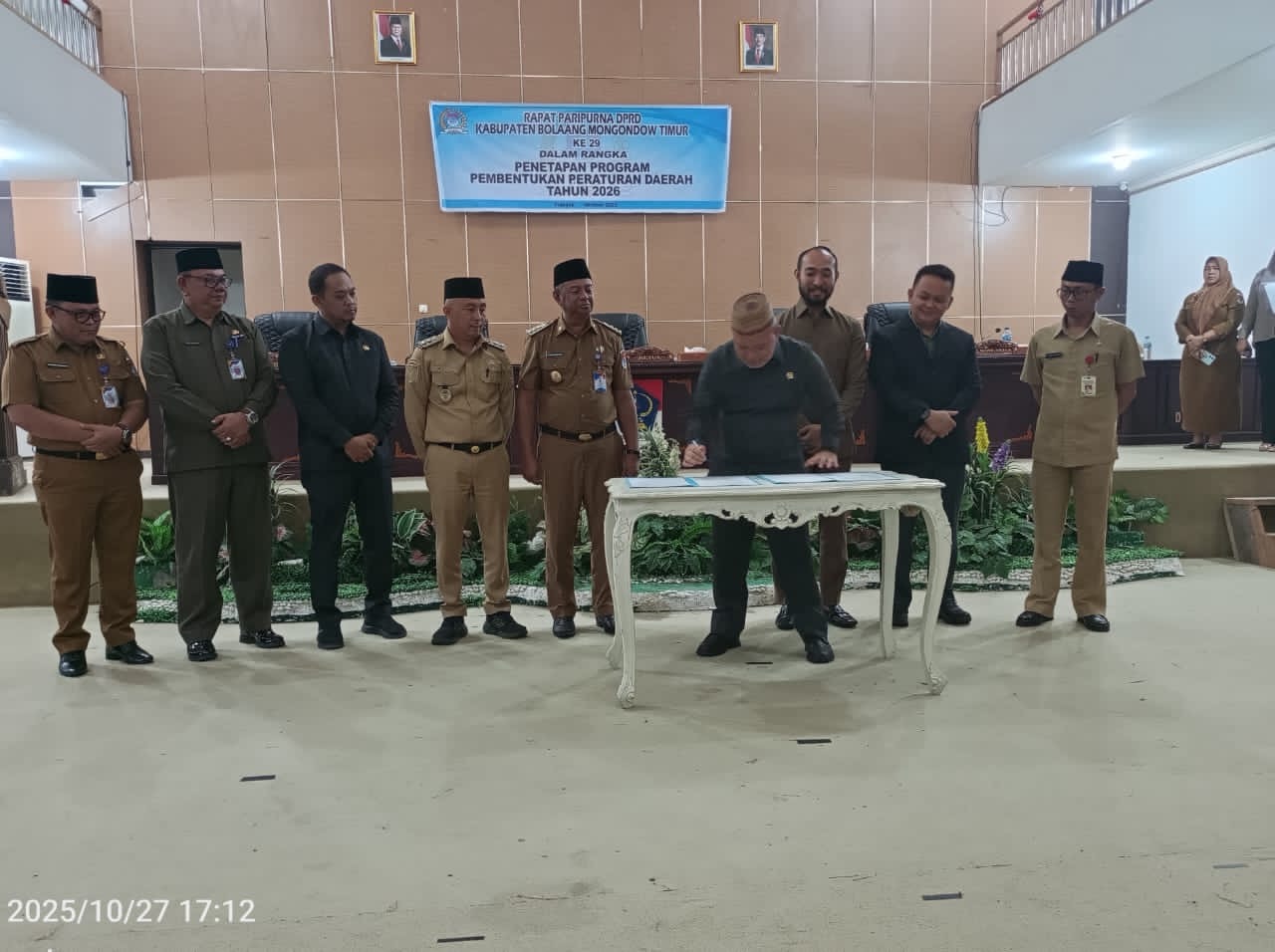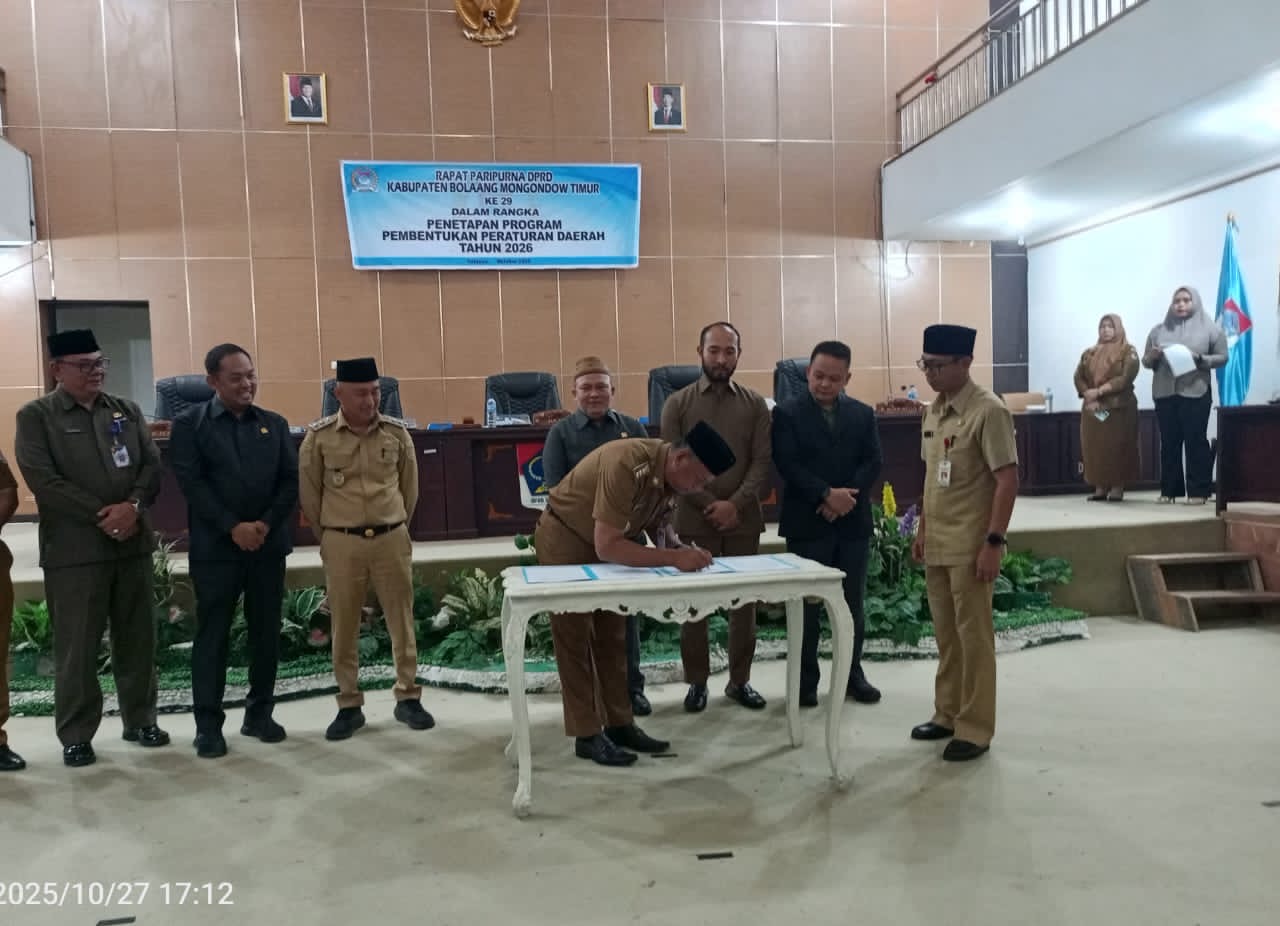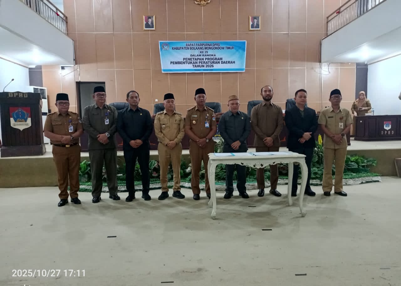 Sulawesi Kini, Boltim – Dewan Perwakilan Rakyat Daerah (DPRD) Kabupaten Bolaang Mongondow Timur (Boltim) resmi menetapkan Program Pembentukan Peraturan Daerah (Propemperda) Tahun 2026. Penetapan ini dilakukan dalam Rapat Paripurna ke-29 yang digelar di ruang sidang utama DPRD Boltim, Senin 27/10/25 sore.
