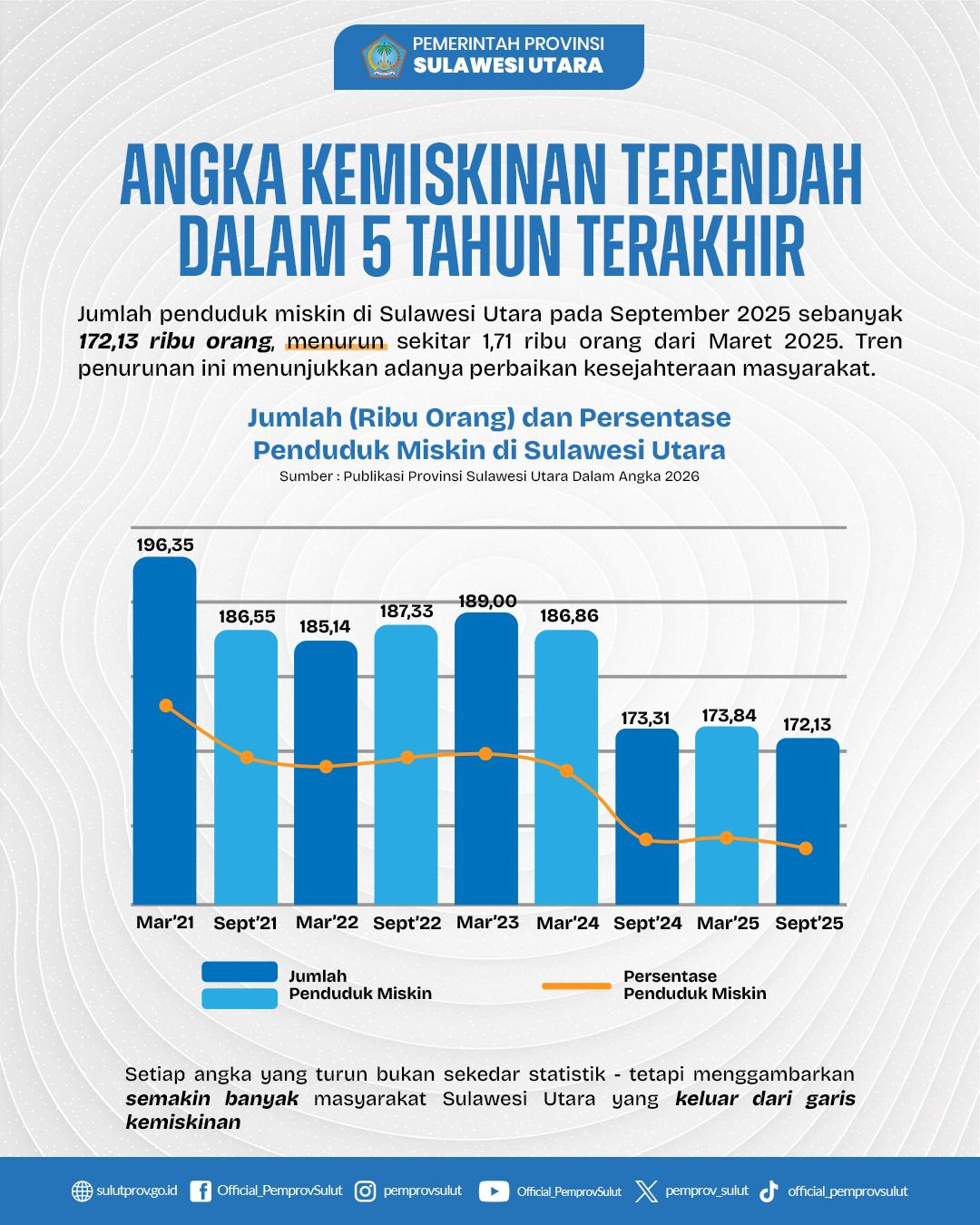 Salah satu pencapaian paling bermakna bagi masyarakat adalah penurunan angka kemiskinan yang konsisten. Per September 2025, jumlah penduduk miskin di Sulut tercatat sebanyak 172,13 ribu orang.