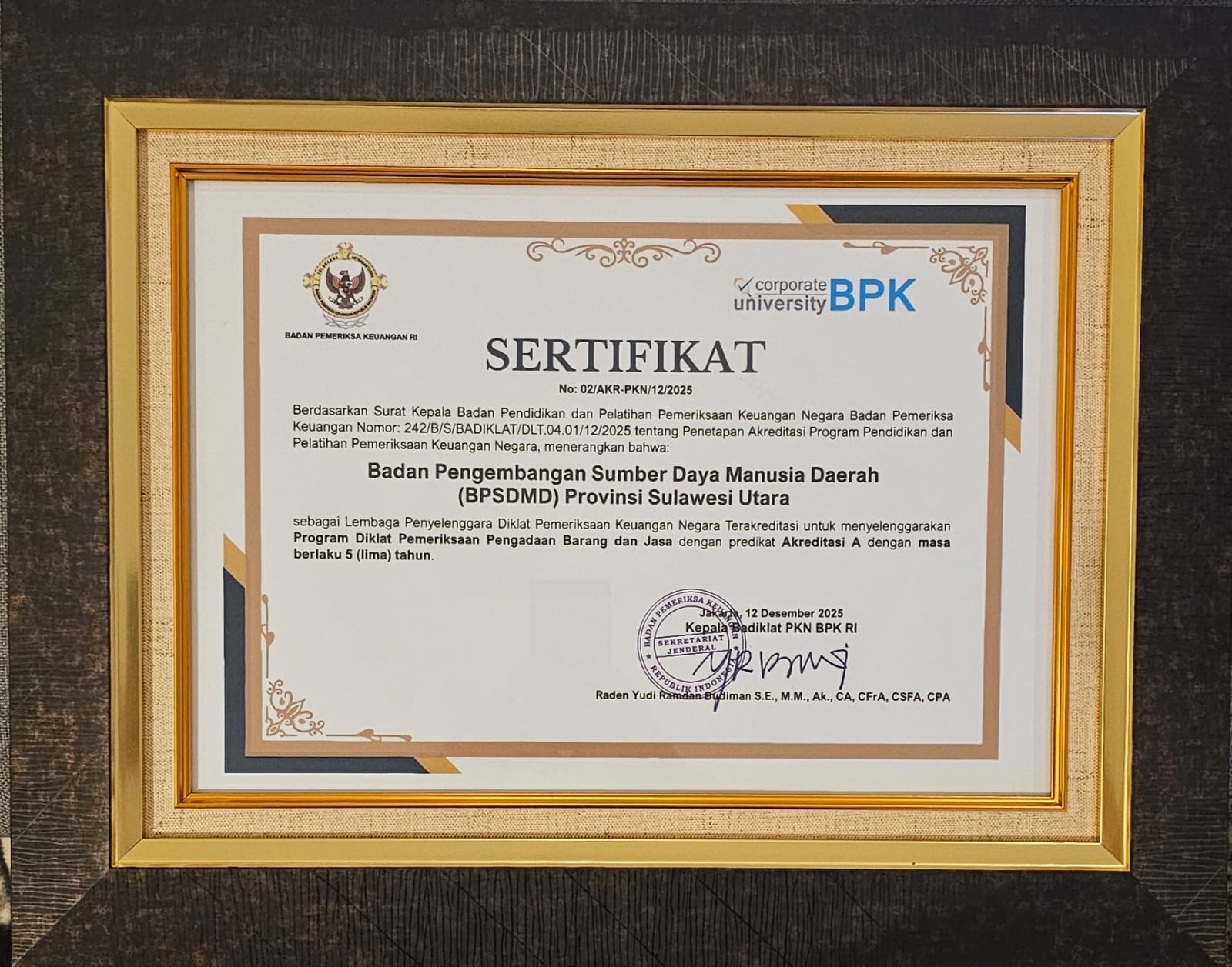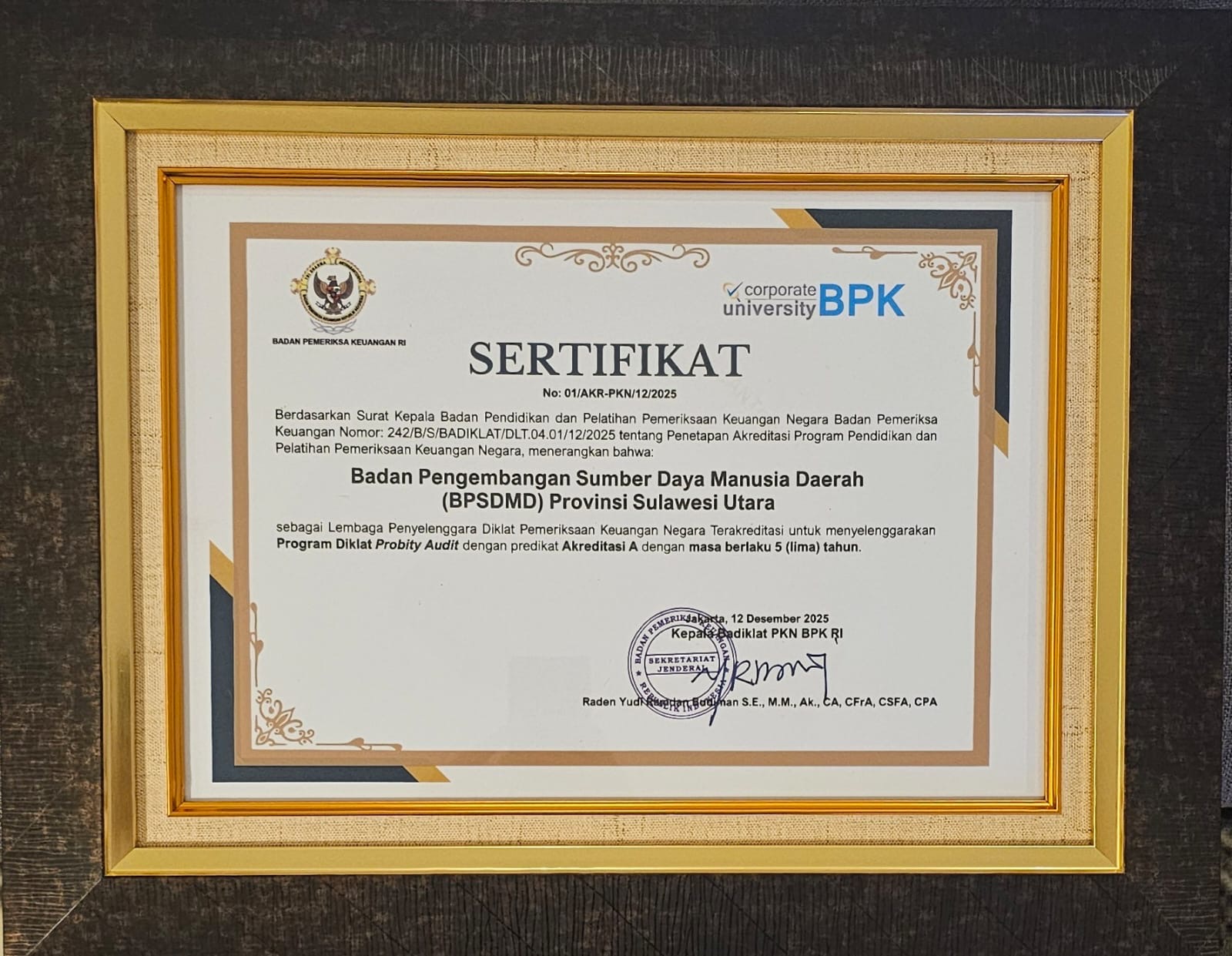 Dimana, Pemprov Sulut berhasil meraih penghargaan Sertifikat Akreditasi Pelatihan dengan nilai A di bidang Pemeriksaan Keuangan Negara. Penghargaan sertifikat akreditasi tersebut diserahkan hari ini, Selasa, 27 Januari 2026 di Badiklat PKN BPK RI, Jakarta.