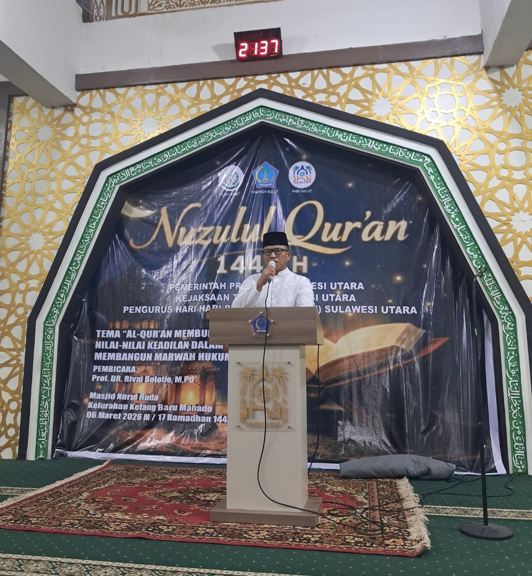 Sulawesi Kini, Manado – Gubernur Sulawesi Utara (Sulut), Mayjend TNI (Purn) Yulius Selvanus yang diwakili Kepala Dinas Koperasi dan UKM Pemprov Sulut, Tahlis Gallang SIP MM menghadiri peringatan malam Nuzulul Quran, Jumat 6 Maret 2026 bertempat di Masjid Nurul Huda, Kelurahan Ketang Baru, Manado.