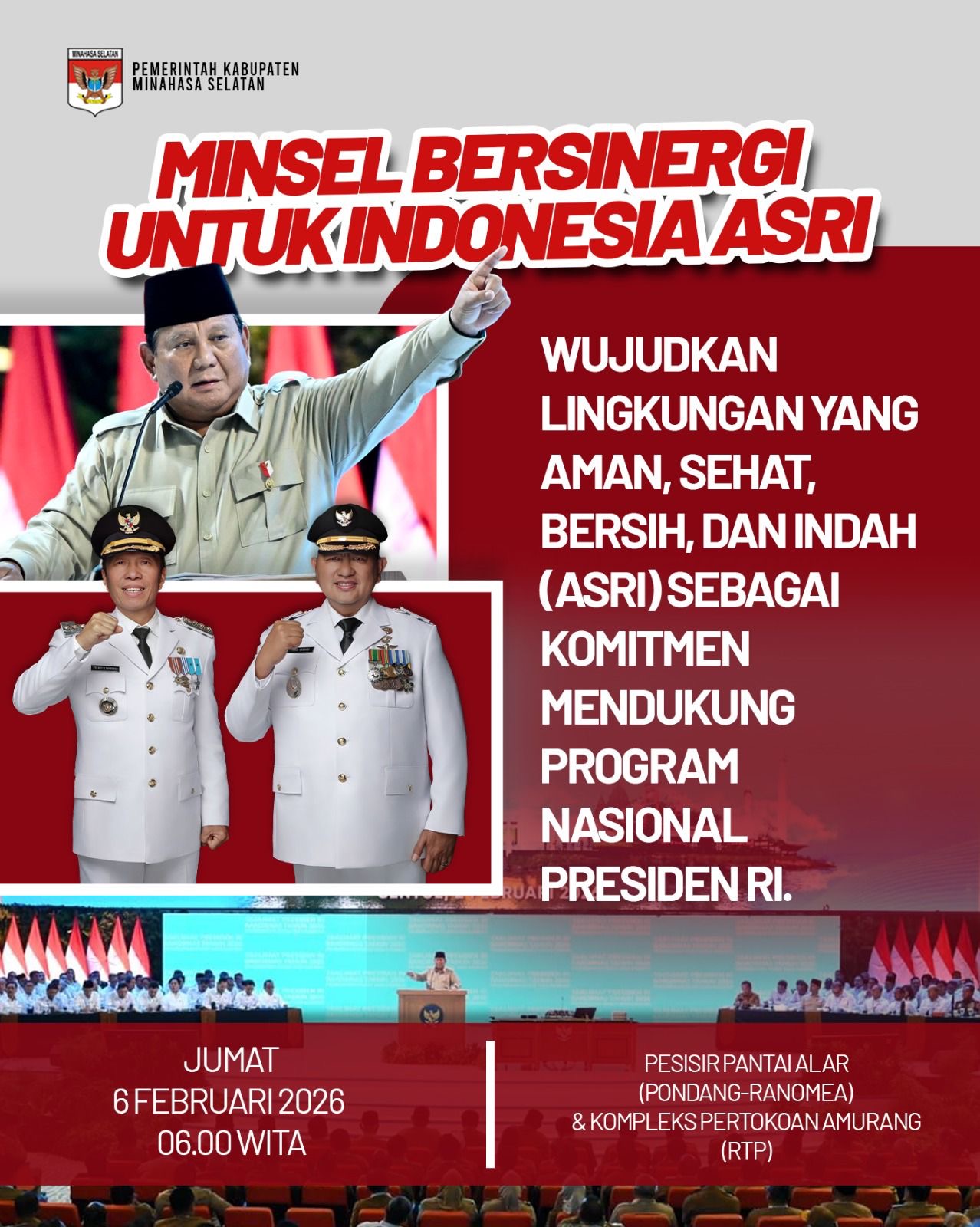 Bupati Minahasa Selatan, Bapak Franky Donny Wongkar, S.H., dan Wakil Bupati Minahasa Selatan, Bapak Brigjen TNI (Purn.) Theodorus Kawatu, S.I.P., bersama segenap jajaran Pemerintah Kabupaten Minahasa Selatan berkomitmen untuk terus mendukung pelaksanaan Gerakan Indonesia ASRI melalui kegiatan yang terencana, terarah, dan berkelanjutan dalam rangka mewujudkan kondisi lingkungan daerah yang bersih, sehat, tertata, serta mendukung peningkatan kualitas hidup masyarakat.